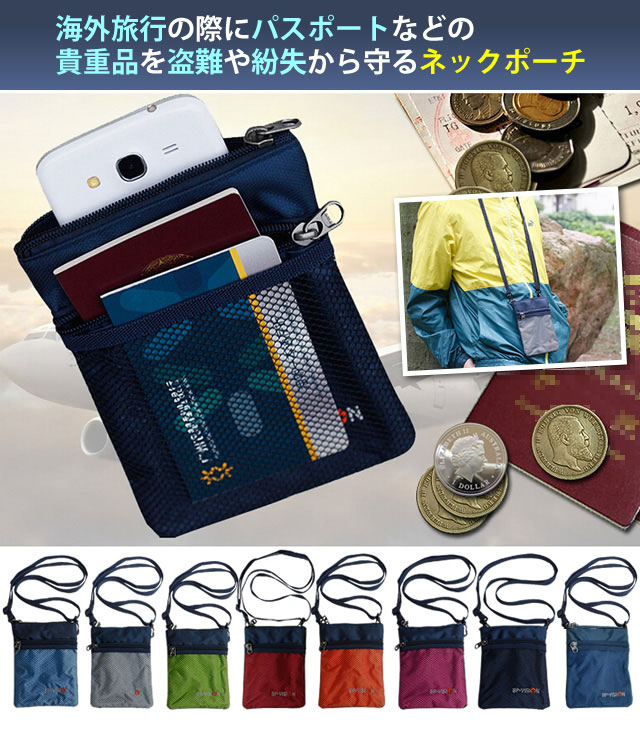 海外旅行の際にパスポートなどの貴重品を盗難や紛失から守る、首から下げるタイプの貴重品入れです。