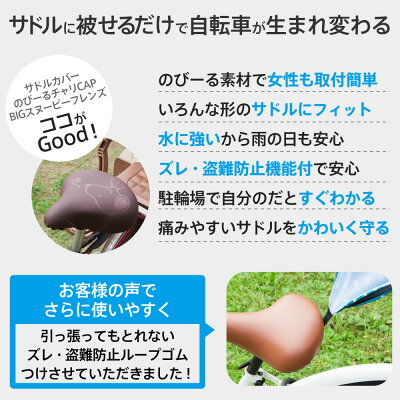 そこで今回、そのような不安を解決すべく、ズレ・落下防止、盗難抑止のゴム製ループを装備してリニューアルいたしました! これで「乗り降りするたびにズレる」という不安も解消です! この「のびーるーチャリCAP(キャップ)」をご利用いただければ、「サドルが破れちゃって…」「日焼けしてサドルがみすぼらしい…」という悩みともサヨナラ! ヨゴレやキズついたサドルでも、まるで新品のような上品で落ち着いたサドルに変身させますよ。