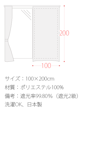 サイズ: 100×200cm 材質: ポリエステル100% 備考: 遮光率99.80%(遮光2級) 洗濯OK、日本製※こちらの商品は1枚ずつの販売となっております。