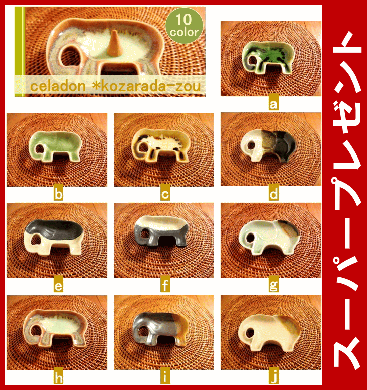 ◎小皿だゾウ / celadon/kozarada-zou ◎タイ・チェンマイより、小皿だゾウ〜上陸!! ■タイ・チェンマイの伝統工芸品・セラドン焼きがゾウさんスタイルになって登場! *アートなカラーで、全10色!上品でモダンなカラーばかりです♪