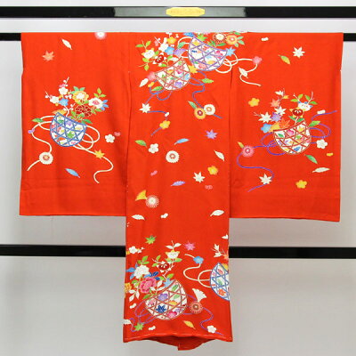 【初着・長襦袢セット ALL正絹 手縫いお仕立て付き】女の子 手描き 初着 産着 祝着 「花籠」赤色 [商品番号jr0011]【あすかや】