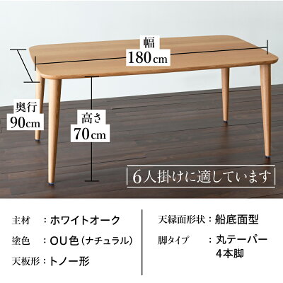 産地名高山市内 内容量 主材:ホワイトオークサイズ:幅180×奥行90×高さ70cm (6人掛けに適しています)塗色:OU色(ナチュラル)天板形:トノー形 天縁面形状:船底面型脚タイプ:丸テーパー4本脚 消費期限 注意事項 ●開梱設置が必要な製品です。