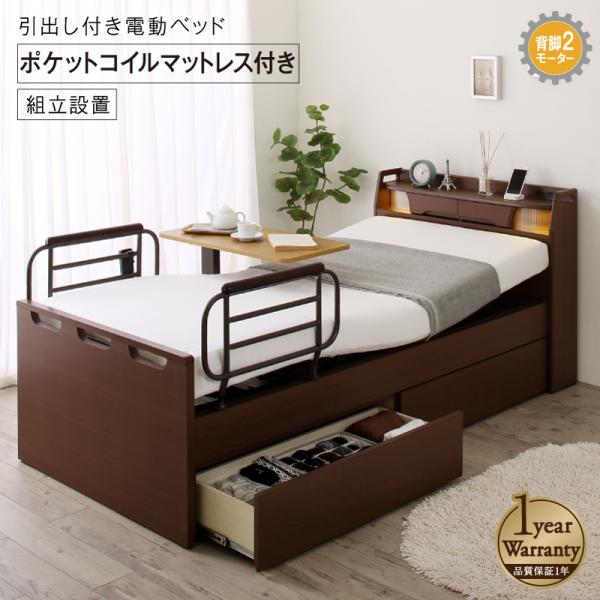 送料無料 組立設置サービス付 介護ベッド シングル 2モーター ベッドフレーム マットレスセット 棚 照明 コンセント 引出し収納付き電動ベッド ラクストレージ ポケットコイルマットレス付き ベッドガード サイドガード 引き出し 収納付きベッド リクライニングベッド