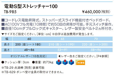 TB-985 電動S型ストレッチャー100 コードレス電動昇降式。