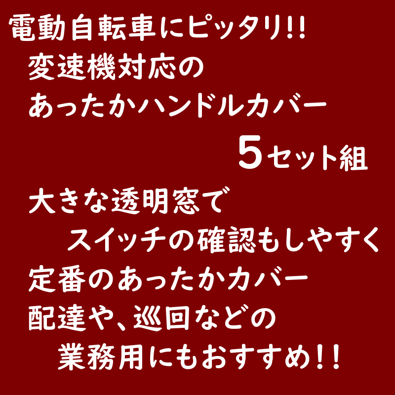 ■特徴 電動自転車にピッタリ!! 変速機対応の あったかハンドルカバー 5セット組(自転車5台分) お好きなカラーを5セット分選んでください!! 大きな透明窓で スイッチの確認もしやすく 定番のあったかカバー 配達や、巡回時の寒さ対策に! 業務用にもおすすめ!! あたたかい冬用のハンドルカバー! 軽快車用(セミアップハンドル)のハンドルカバーです。