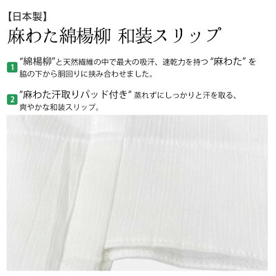真夏の和装スリップ(麻わた汗取りパッド付)夏の爽やか素材、綿楊柳(波しぼクレープ)と天然繊維の中で最大の吸汗、速乾力を持つ“麻わた”を脇の下から胴回りに挟み合わせました。
