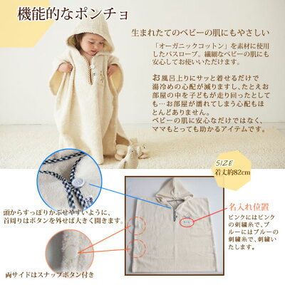 サイズバスローブ(ポンチョ):着丈約82cm(対象年齢:約3歳まで)スタイ:約29×35cmKOROKOROラトル:約6.5×6.5cm箱サイズ約320×250×60mmバスローブ(ポンチョ)、スタイのお名入れひらがな、カタカナ、漢字、アルファベット(ゴシック体)からお選び頂けます。