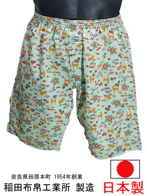 トランクス・すててこ・ふんどし・ロングトランクスの製造通販 稲田布帛工業所かつて「トランクス製造のまち」であった 奈良県田原本町で1954年創業 稲田布帛工業所オリジナルロングトランクスは絶妙な膝丈すててこ 計算された裁断と熟練の縫製で快適ステテコ生活 鹿や猪など縁起もの動物と一緒に真っ赤なお花が描かれているので運気上昇にも効果的?! 日本製ロングトランクスをよりできる限りお安く多くのお客様にお届けするために生地の仕入に一工夫 そのため柄物ロングトランクスは作り切り、売り切りとなります。