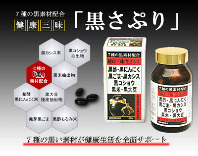 黒三味(黒サプリ)情報 健康三昧「黒さぷり」に使用している黒酢もろみ末は、鹿児島県福山町で伝統的製法により、アマン壷の中で自然に発酵熟成された黒酢のみを使用。
