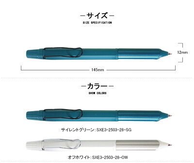 【ブランド】 三菱鉛筆 MITSUBISHI 【種 類】 ノック式多機能ペン 【品 名】 3色ボールペン ジェットストリーム エッジ JETSTREAM EDGE 【芯 径】 黒・青・赤 / 0.28mm 【カ ラ ー】 オフホワイト:SXE3-2503-28-OW サイレントグリーン:SXE3-2503-28-SG 【サ イ ズ】 長さ:約145mm 最大胴軸径:約12mmφ 重さ:約17g 【仕 様】 先軸:ABS樹脂、アルミグリップ付 後軸:アルミ+塗装 クリップ:ステンレス ダイヤル:ABS樹脂 【付 属 品】 メーカー純正ケース 【消 耗 品】 ボールペン替え芯:SXR-203-28 【商品説明】 商品名「EDGE(エッジ)」に、「鋭さ」「切れ味」「限界」という意味を込めた突出した鋭い特長を持つ「ジェットストリーム エッジ」。