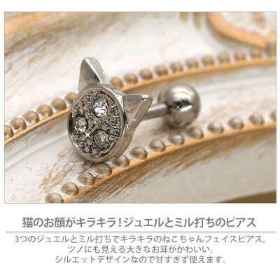 Item Info プチサイズの猫のお顔がキラキラ輝くピアス 3つのキュービックジルコニアがはめ込まれた、キラキラ猫のシンプルなデザインのバーベル。