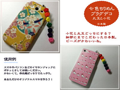 ■商品詳細 材質:ちりめん、ビーズ など 対応:Φ3.5mmイヤホンジャック付属のスマートフォン・オーディオ等 ■注意点 ※イヤホンジャックを傷つけないよう引っ張ると簡単に抜ける仕様になっておりますので、落下防止にはお使いいただけません。
