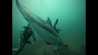 なまこを持ってダイバーと遊びにくるイルカ くん 一緒に泳いだり、撫でたりすると喜びます この日はたくさん遊んでくれました …