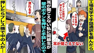 【漫画】耳が聞こえない私は工場見学で手話ができる同級生に手話通訳をお願いすることに…同級生が手話で「ボタンを押せ」と伝えてきたので素直に押したら目の前のプレス機が動き出して中にいた人が大変な事に・・・