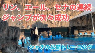 名古屋港水族館で行われているシャチの公開トレーニングです。シャチのリン、イルカのエールとセナが参加しています。 三頭で …